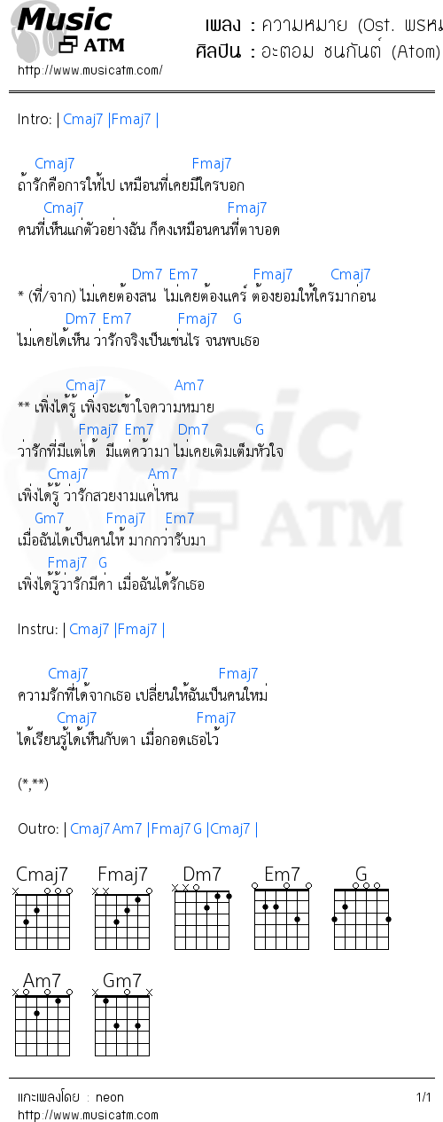 คอร์ดเพลง ห้ามทิ้ง ของ อะตอม สำหรับประกอบการเล่นกีตาร์.